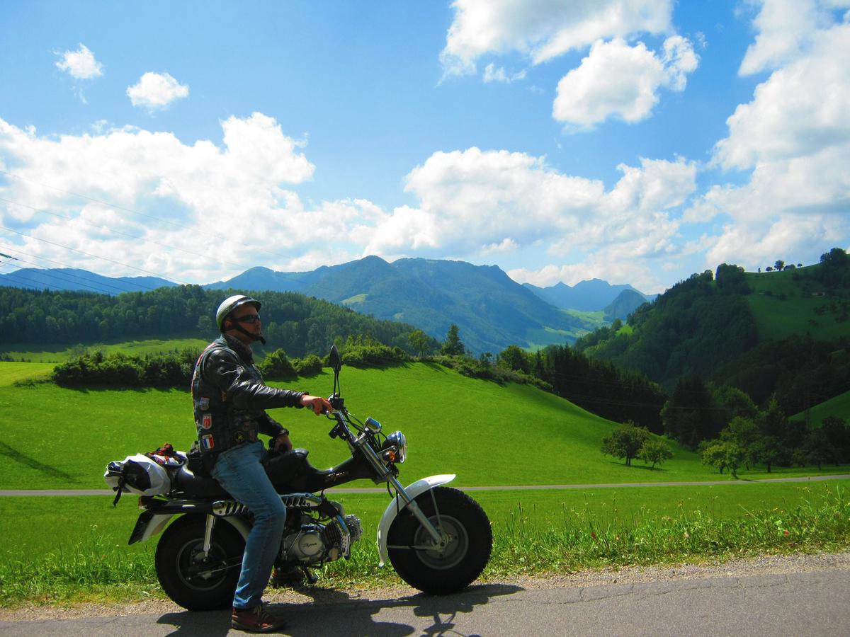 především po alpských zemích, o cestování na motocyklu,