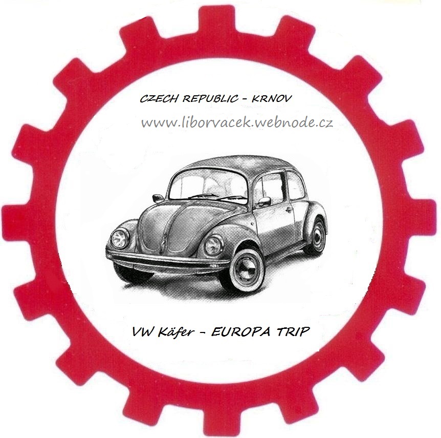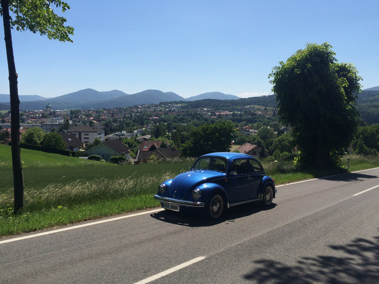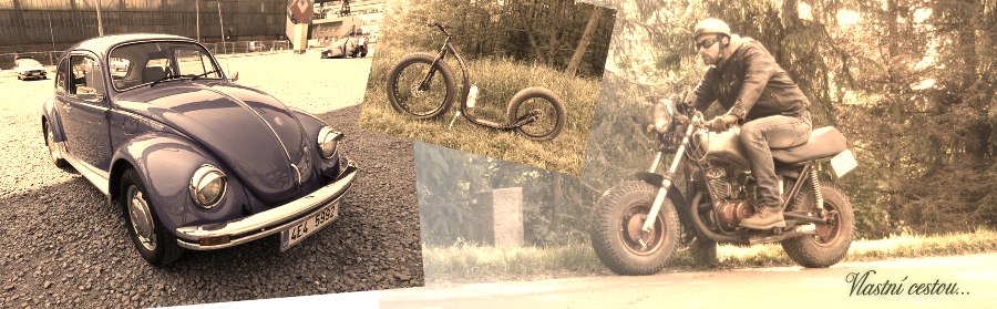 vozidlem volkswagen brouk a na koloběžce.